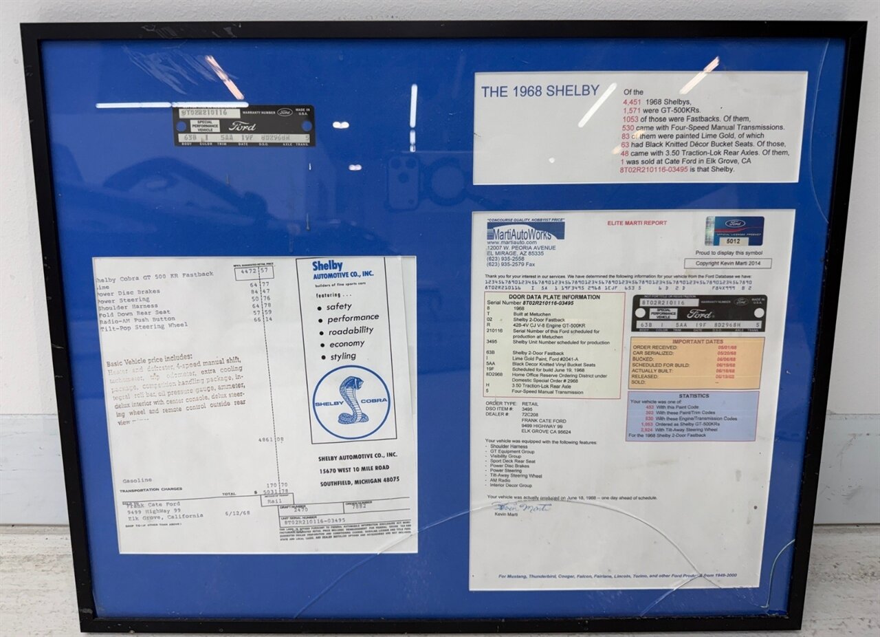 Full Marti Report! (See photos) It's the GT500 KR, 7.0L V8, 4 speed manual transmission! Power disc brakes, power steering, fold down rear seats, tilt pop steering wheel, shoulder harness. Largely original paint, well cared for in a climate-controlled storage this GT500 KR is the one you're looking for!