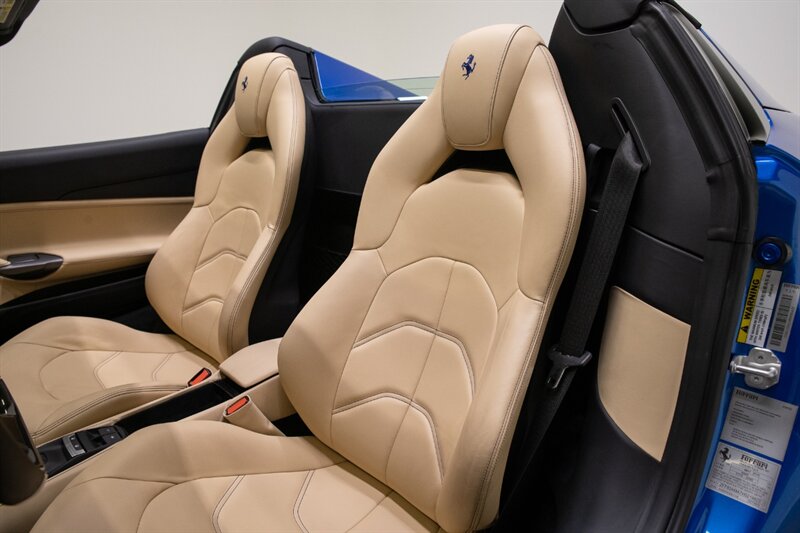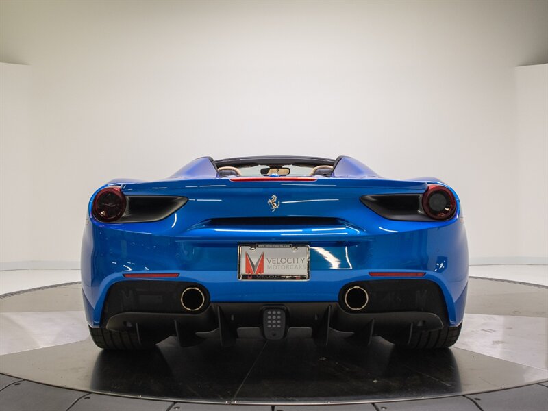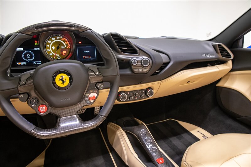 660 HP and 561 lb./ft. of torque never felt so good! This 2 owner trade 488 Spider comes loaded with the following factory options: Yellow brake calipers, carbon fiber driver zone + LEDS, carbon fiber central bridge, electric seats, Cavallino stitched on headrests Blu, Colored mats with LOGO, Scuderia Ferrari Shields, IN/OUT Electric mirrors + homelink, front and rear parking cameras, front and rear parking sensors, 20" forged painted rims, Yellow rev counter, colored Blu stitching. As an added benefit Xpel film has been added to cover the front clip.