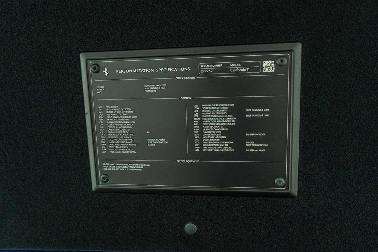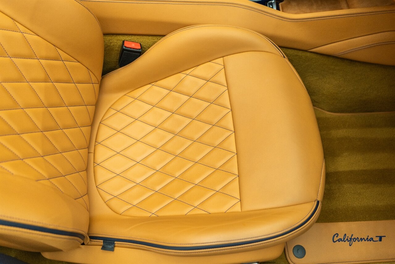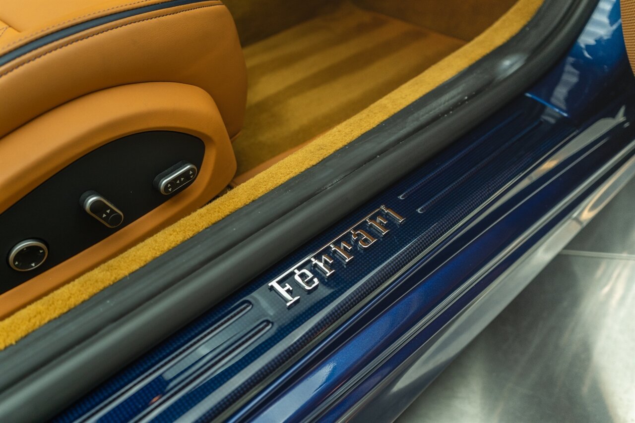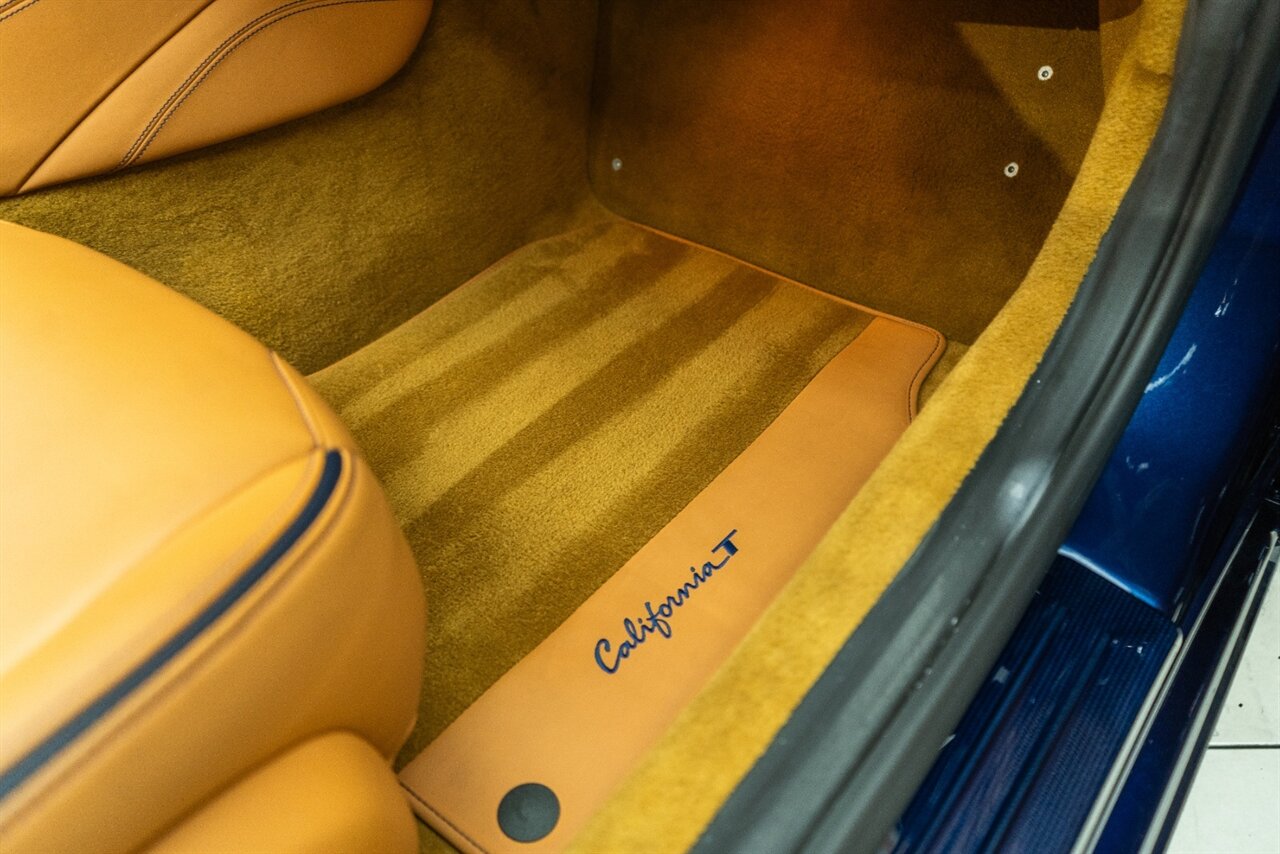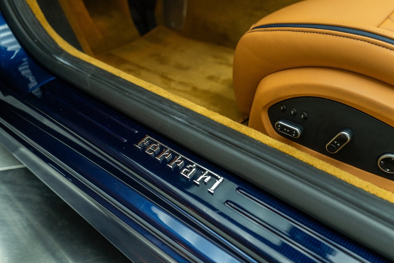 This VERY SPECIAL Tour de France Blu California T came from its' single owner and the build is out of this world! Starting with the Blue Carbon Fiber throughout the cabin and door sill plates to compliment the Tour de France Blu so nicely. Full leather interior throughout the cabin including the convertible roof in bespoke Blu Sterling leather to match the dash and upper door leather. Diamond stitching on the full electric and heated seats complimented by Blu Sterling thread add to the beauty of this unique build. Freshly serviced and ready for you to enjoy, this ONE OF A KIND California T is something special!