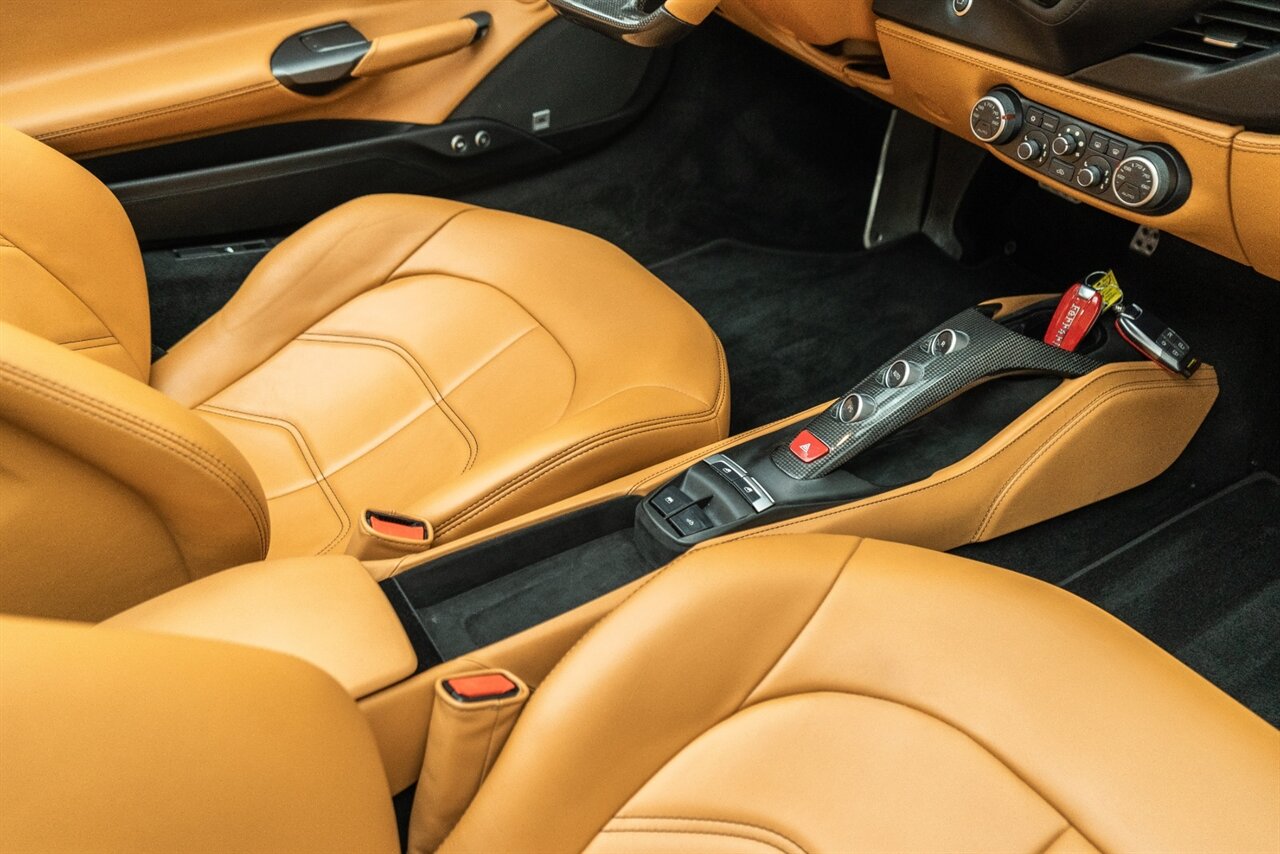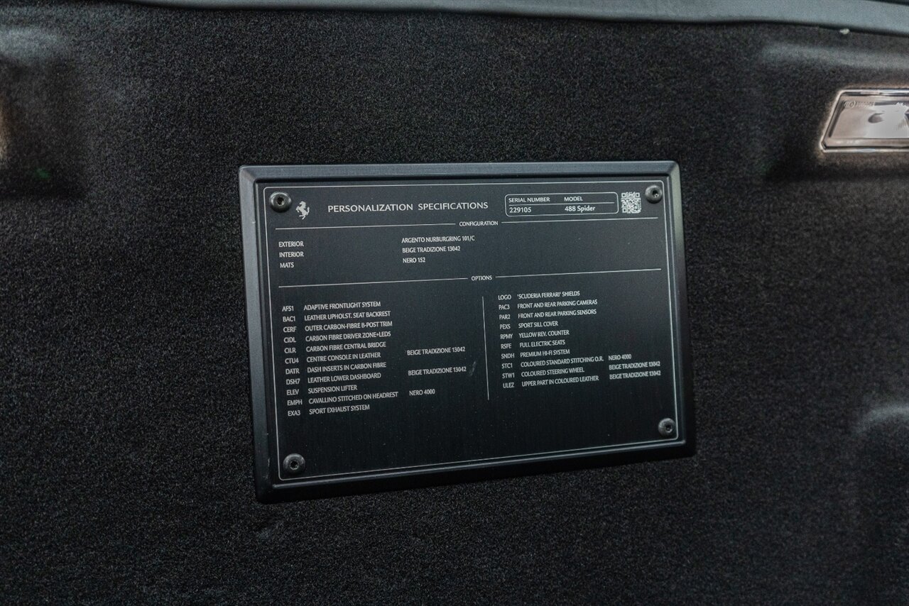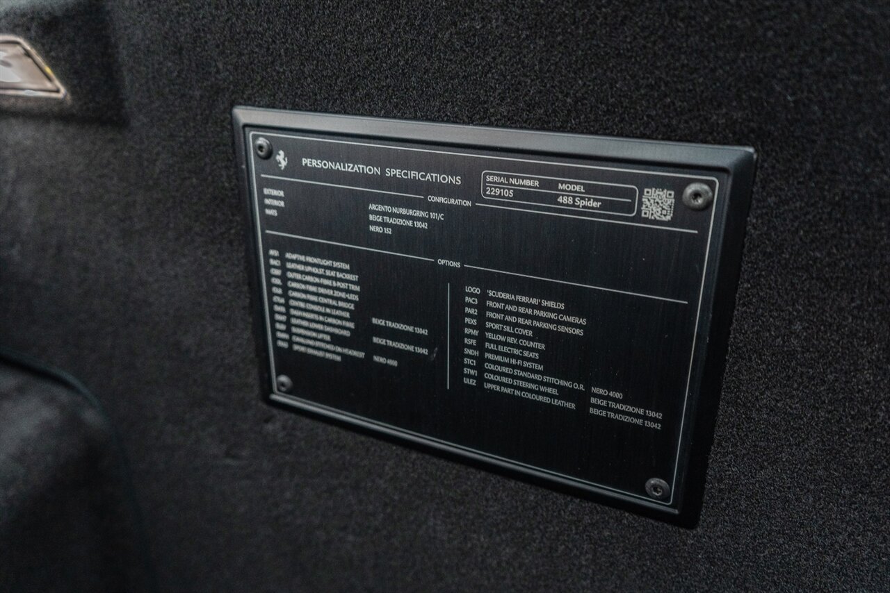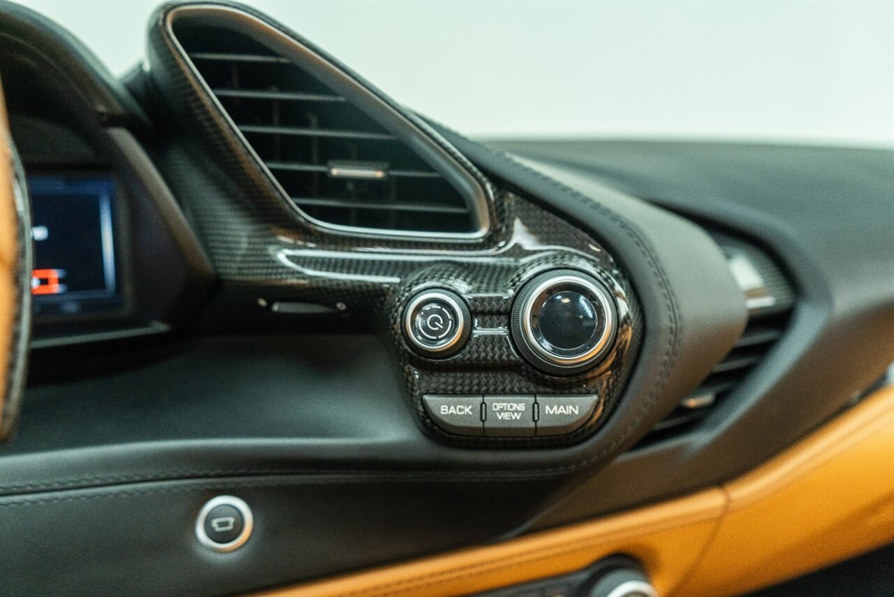 The 660 HP Ferrari 488 Spider is an absolute JOY to drive! The endless torque from the twin turbo V8 will leave a smile on your face every time you get behind the wheel! Factory options include: Carbon Fiber LED steering wheel, carbon fiber central bridge, carbon fiber full dashboard, carbon fiber B pillar, FULL electric and heated seats, Front SUSPENSION LIFTER, black wheel, yellow brake calipers, JBL Sound system upgrade, Scuderia Ferrari shields, front and rear parking cameras with park distance control, Sport exhaust pipes in black. Beautiful service history and freshly serviced here at Velocity, this is the 488 Spider you are looking for!