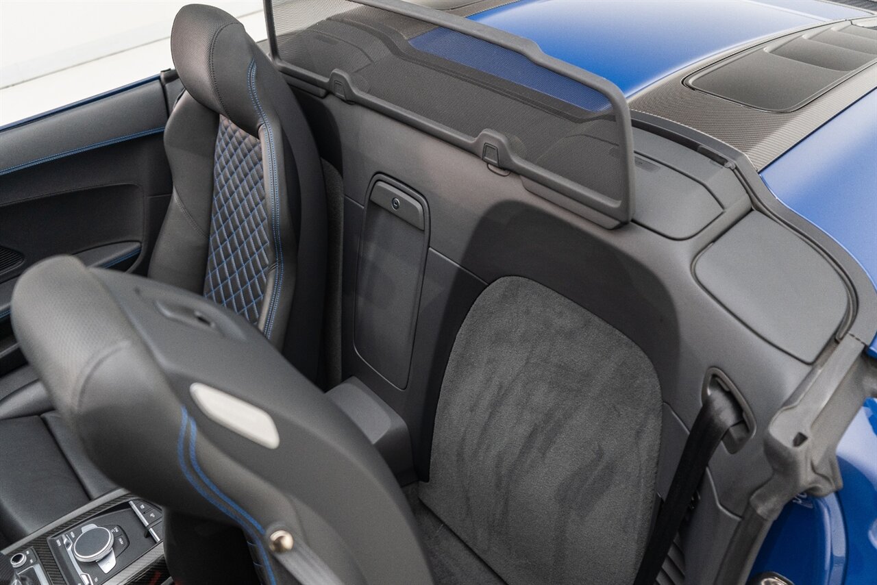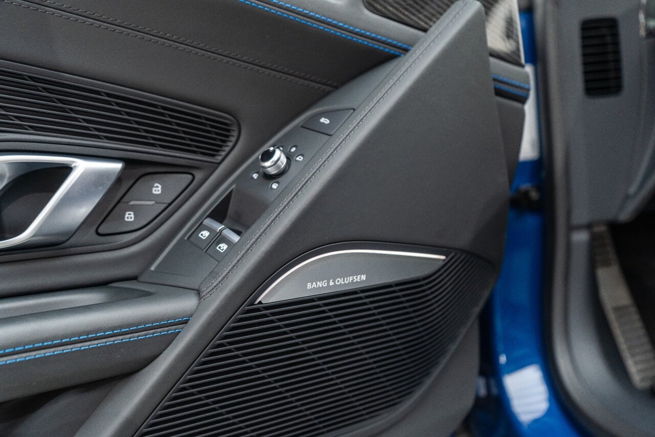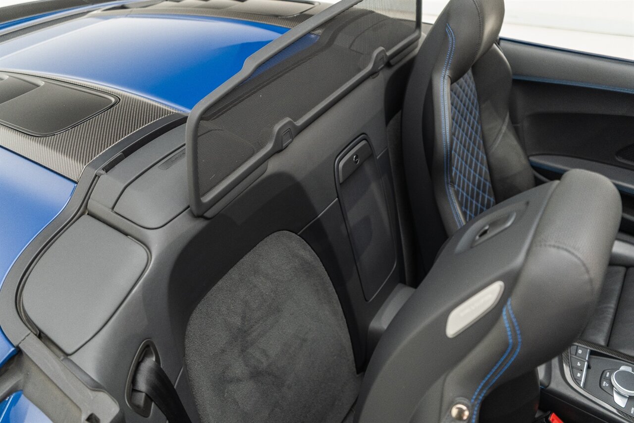 This amazingly beautiful Ascari Blue Spyder turns some heads! LOADED with Carbon Fiber front spoiler, rock inlay and rear diffuser, Sport seat package with Diamond stitching full leather, Bang and Olufsen Sound system, Dynamic Steering, black Audi badges and Anthracite black wheels. Freshly serviced and ready for you, this R8 Performance Spyder is beautiful!