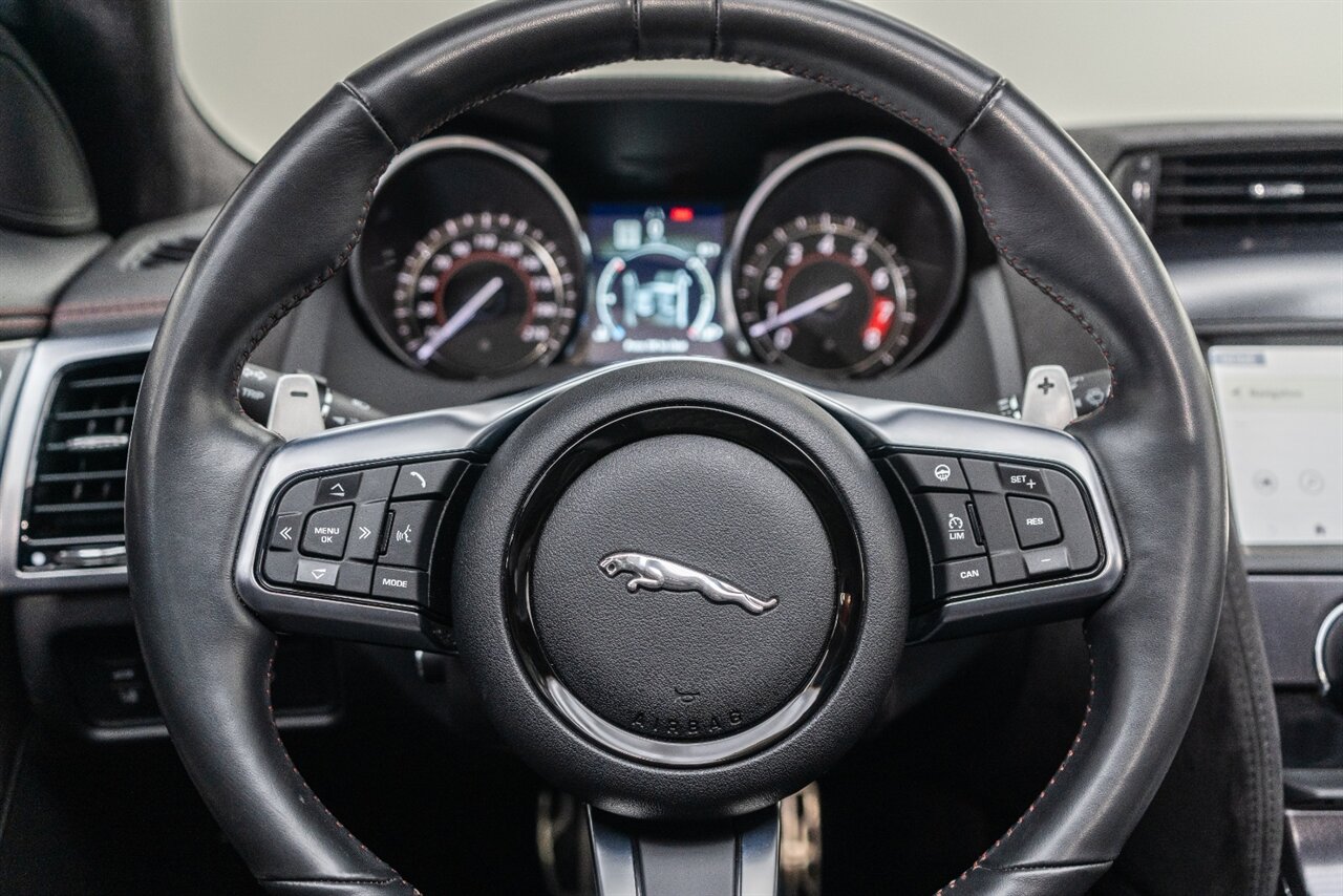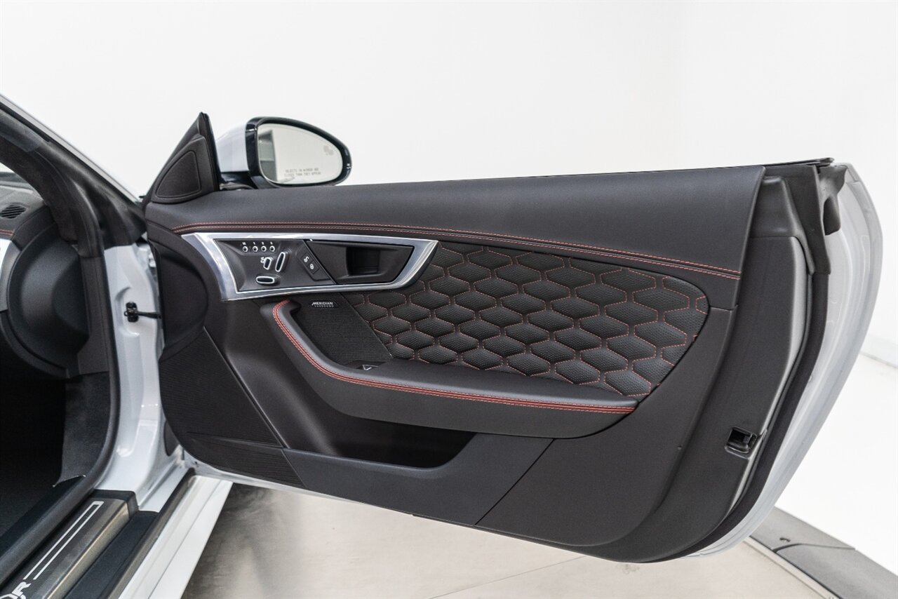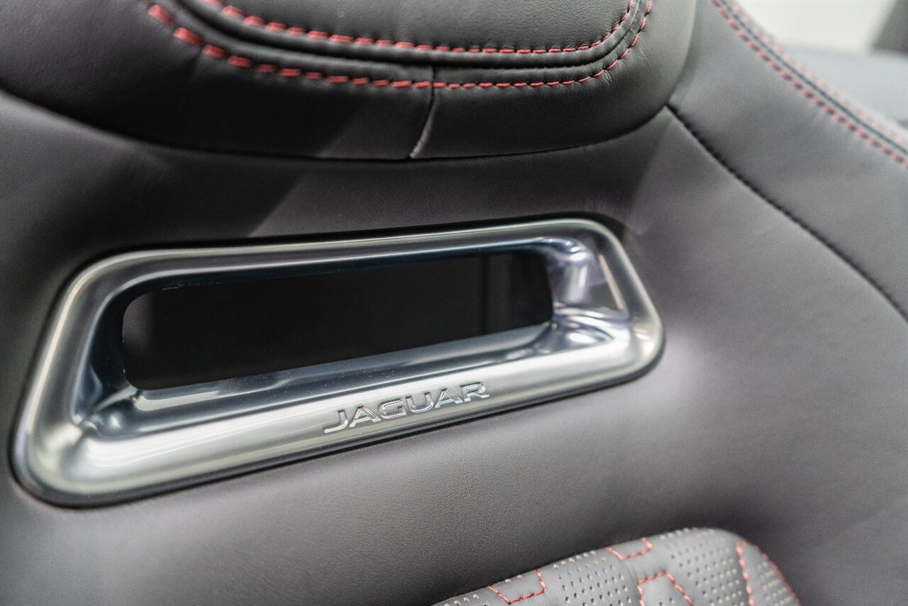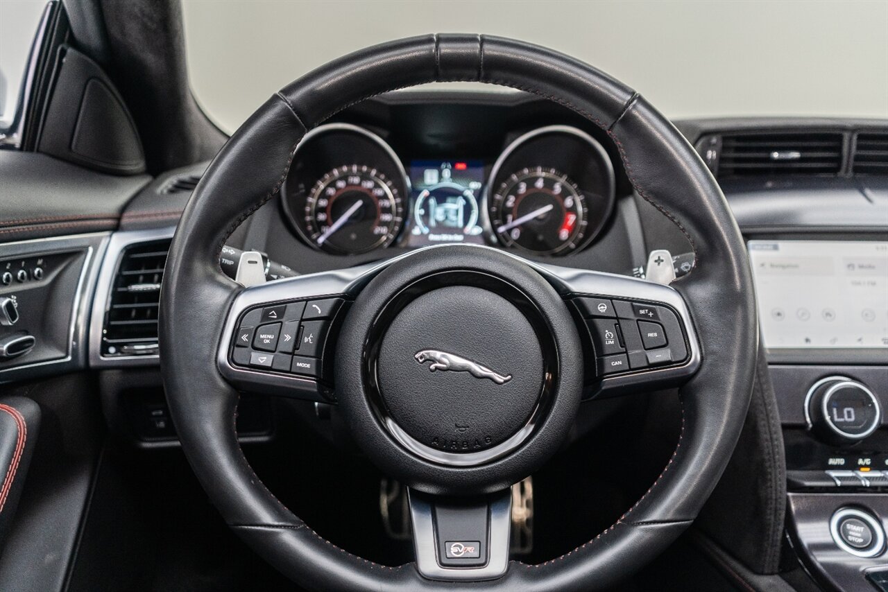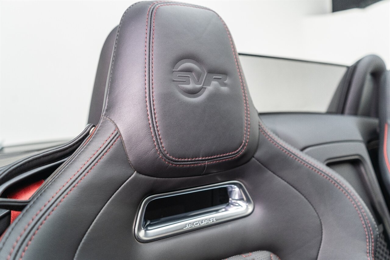 There is something about a supercharged V8 that gets your blood flowing! This Jaguar SVR convertible does not disappoint! 575HP gets delivered through the smooth 8 spd auto transmission. Enjoy teh 770 W Merdian sound system upgrade, red seat belts to match your red stitching, park assist, blind spot assist, rear traffic monitor and homelink garage door butttons round out the factory options. We have just fully serviced and replaced all 4 tires in our state-of-art service facility. This SVR Jaguar is ready to be enjoyed!