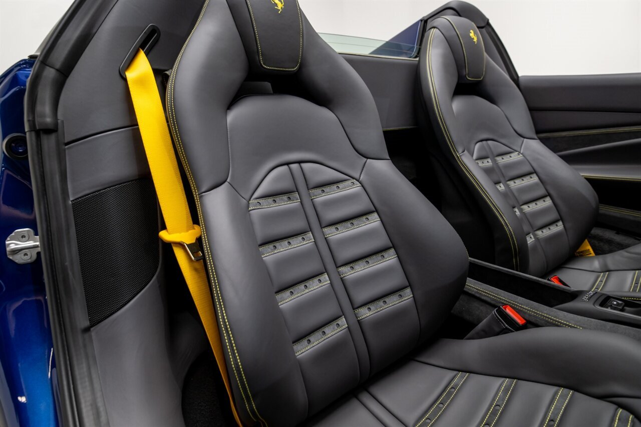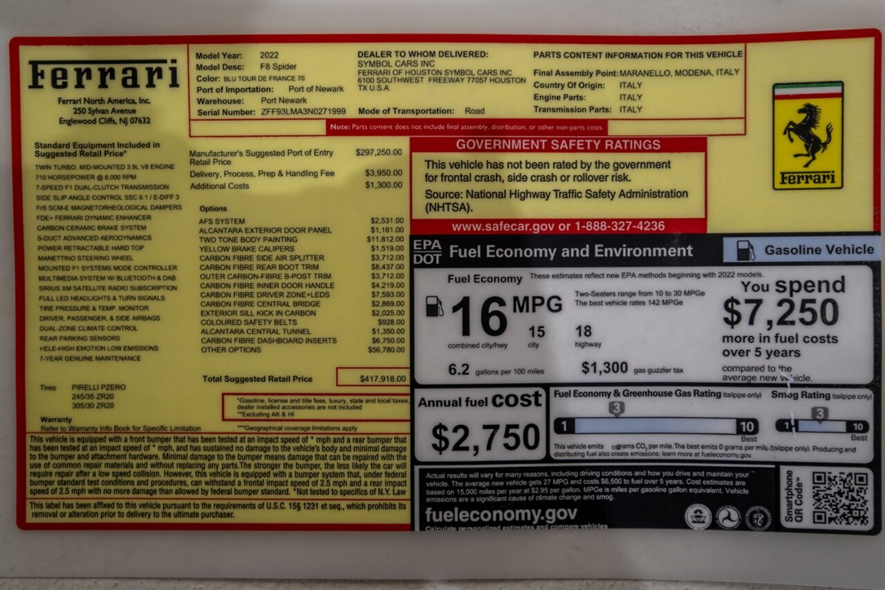 This special one off Tour De France Blu F8 Spider absolutely turns heads! Loaded with factory options this F8 will not leave you longing for more. Factory options include: AFS Headlamps, Front suspension lifter, Alcantara exterior door panel, Tow tone body painting, yellow brake calipers, Carbon Fiber Side splitter, Carbon Fiber rear boot trim, Out carbon Fiber B post trim, Carbon Fiber interior door handle, Carbon Fiber Driver Zone + LED steering wheel, Carbon Fiber central bridge, Exterior sill kick in carbon fiber, coloured safety belts, Alcantara central tunnel, Carbon Fiber dashboard inserts, Other Options $56,780! This dream car will find its' new owner in "AS NEW" condition. All key, books, tools and original window sticker accompany this F8 Spider!