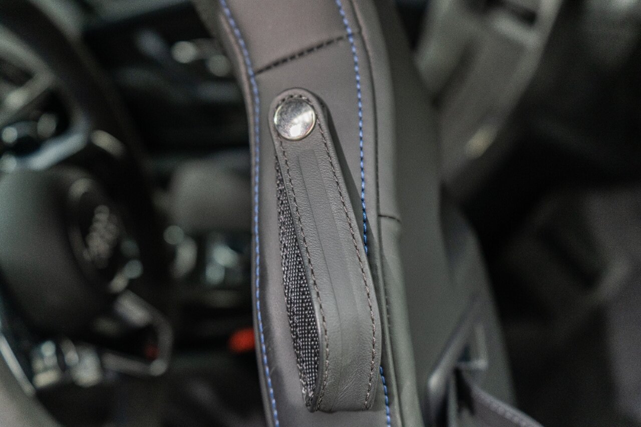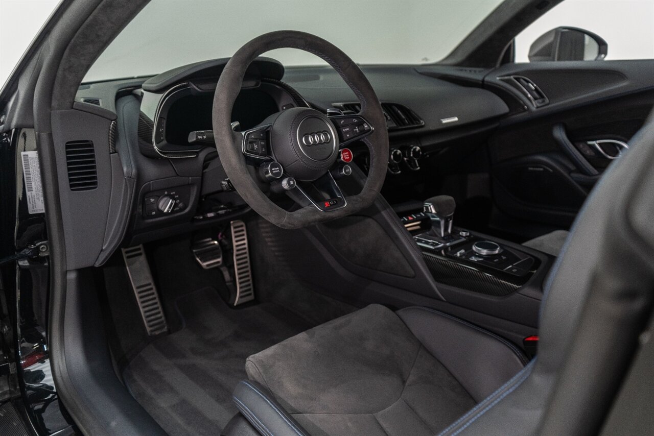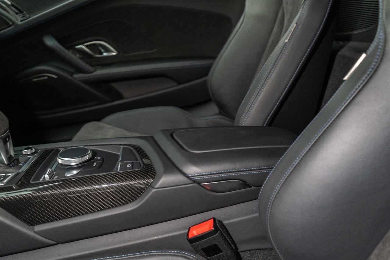 The last of an ERA naturally aspirated V10 Performance Quattro! 602 horsepower revs to the MOON! This freshly serviced and beautiful R8 comes with the following factory options: Mythos Black Metallic Paint, CARBON FIBER FRONT SPOILER, ROCKER INLAY, and EXHAUST SURROUND. R* Performance design package (Alcantara steering wheel, Blue brake calipers, floor mats with blue stitching, gear selector alcantara, Leather/Alcantara seats, BANG AND OLUEFSUN sound system, Dynamic steering, black Audi rings and badges. Enjoy this stunning R8 TODAY!