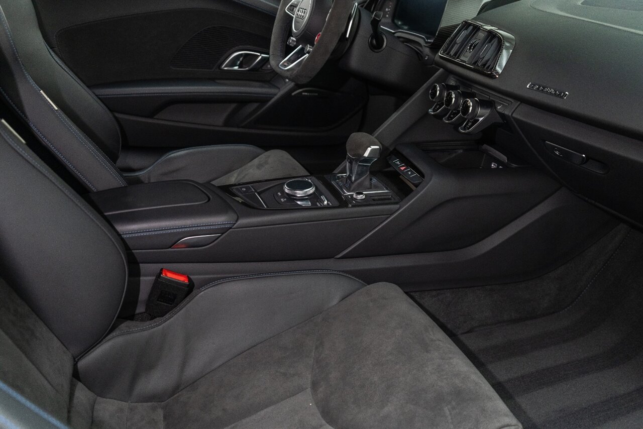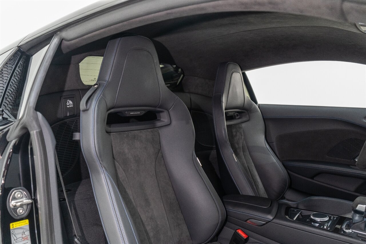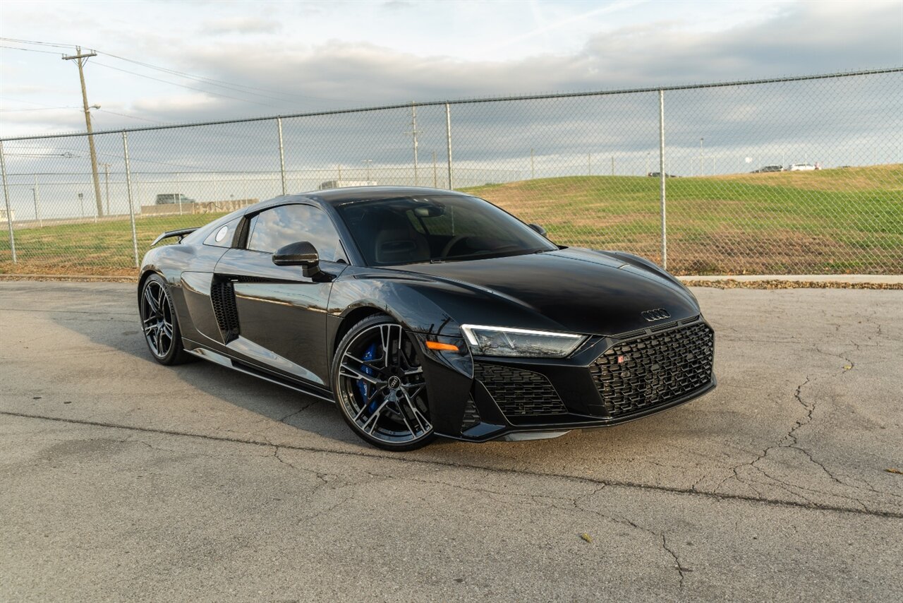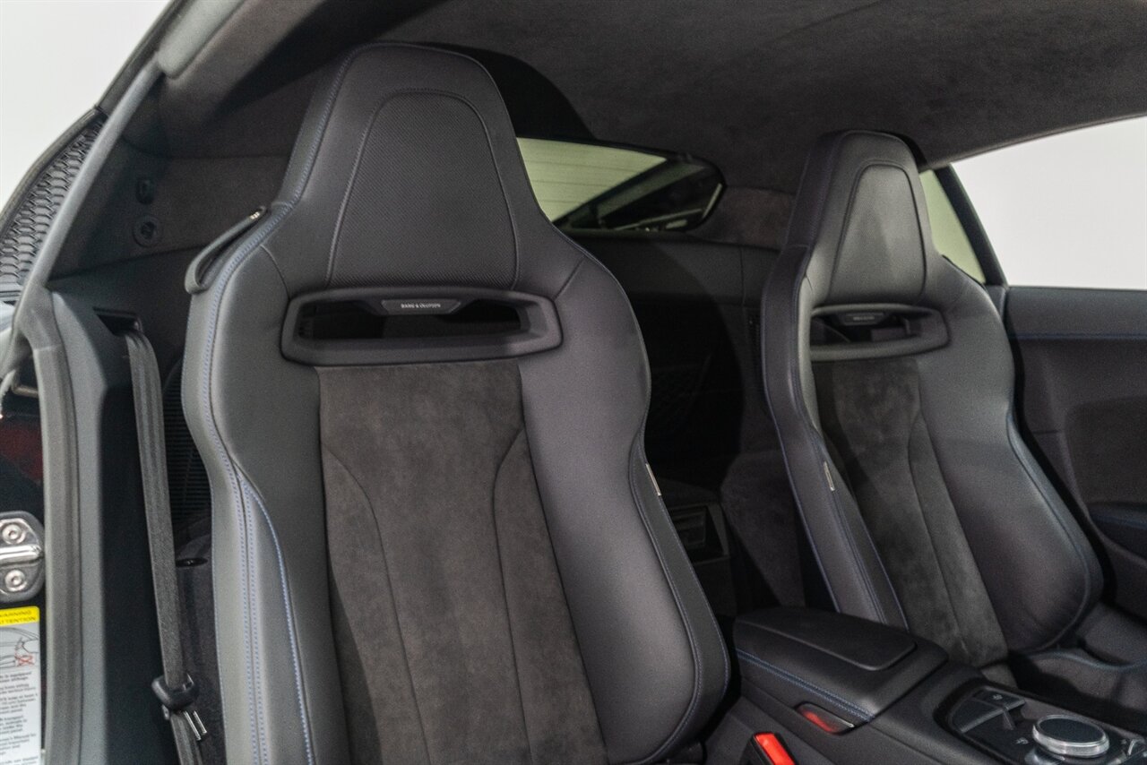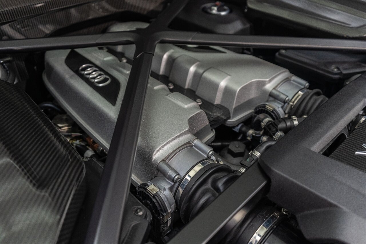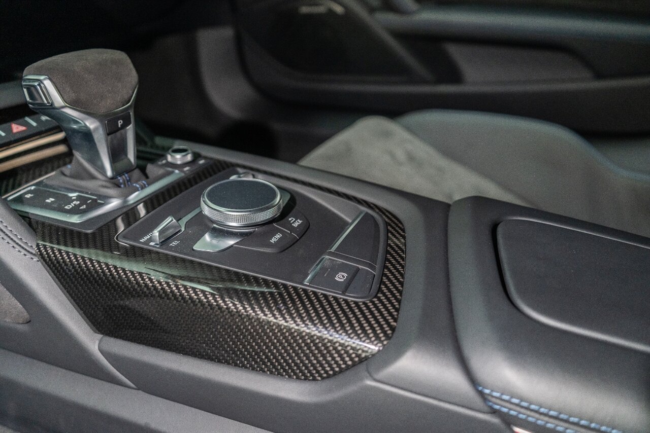 The last of an ERA naturally aspirated V10 Performance Quattro! 602 horsepower revs to the MOON! This freshly serviced and beautiful R8 comes with the following factory options: Mythos Black Metallic Paint, CARBON FIBER FRONT SPOILER, ROCKER INLAY, and EXHAUST SURROUND. R* Performance design package (Alcantara steering wheel, Blue brake calipers, floor mats with blue stitching, gear selector alcantara, Leather/Alcantara seats, BANG AND OLUEFSUN sound system, Dynamic steering, black Audi rings and badges. Enjoy this stunning R8 TODAY!