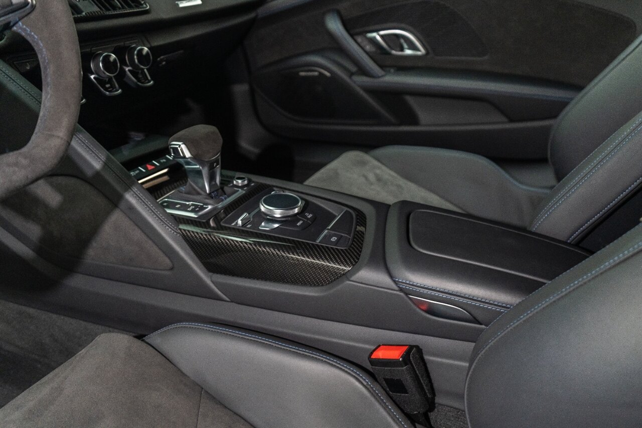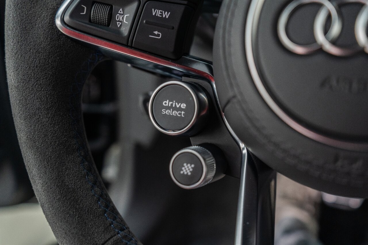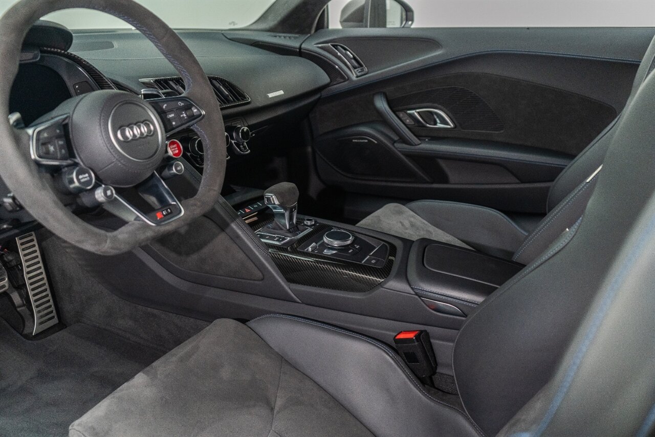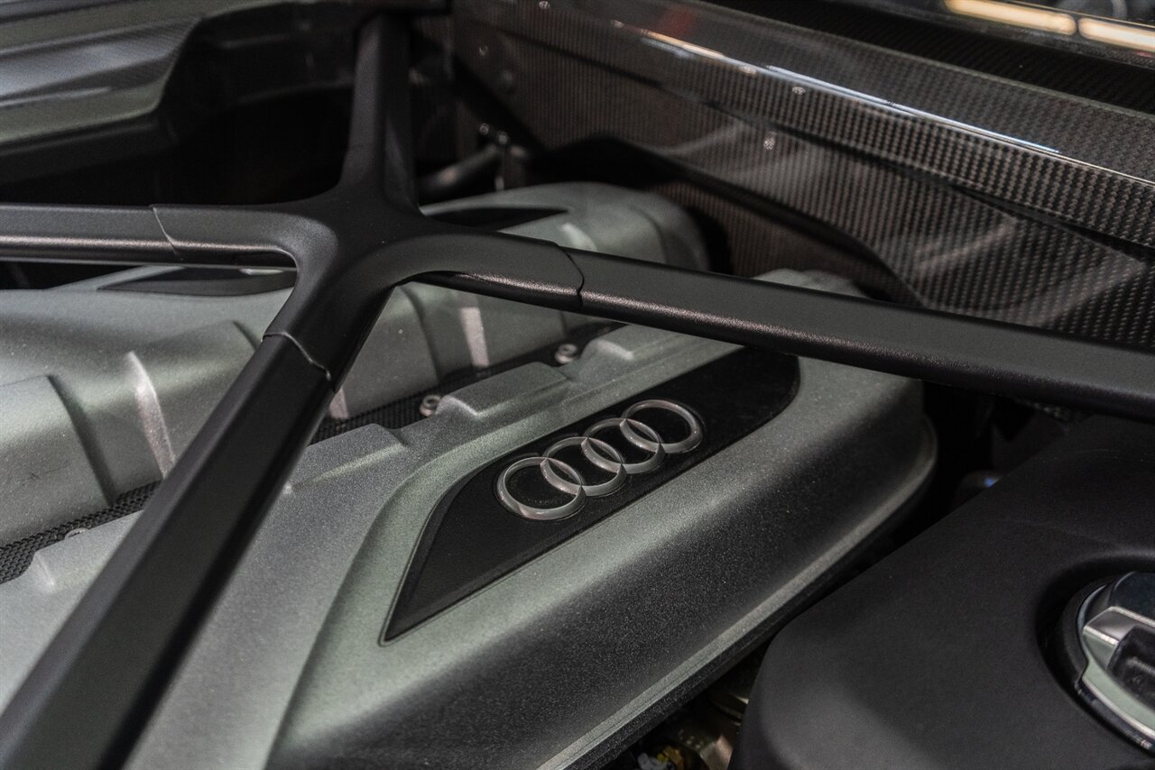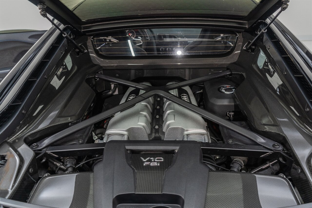 The last of an ERA naturally aspirated V10 Performance Quattro! 602 horsepower revs to the MOON! This freshly serviced and beautiful R8 comes with the following factory options: Mythos Black Metallic Paint, CARBON FIBER FRONT SPOILER, ROCKER INLAY, and EXHAUST SURROUND. R* Performance design package (Alcantara steering wheel, Blue brake calipers, floor mats with blue stitching, gear selector alcantara, Leather/Alcantara seats, BANG AND OLUEFSUN sound system, Dynamic steering, black Audi rings and badges. Enjoy this stunning R8 TODAY!