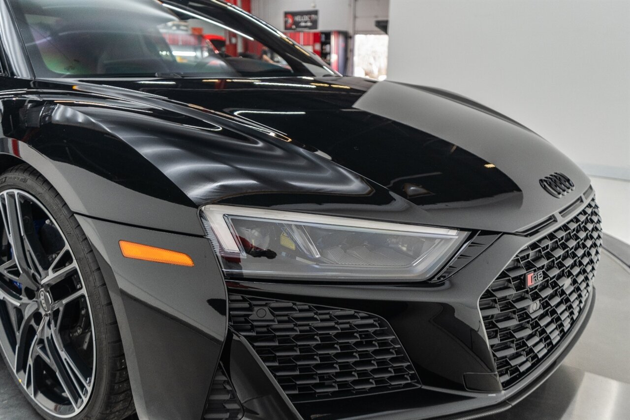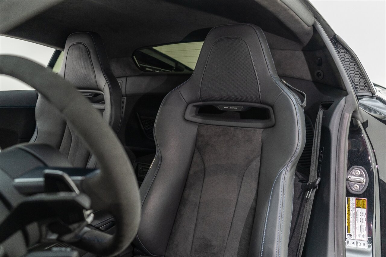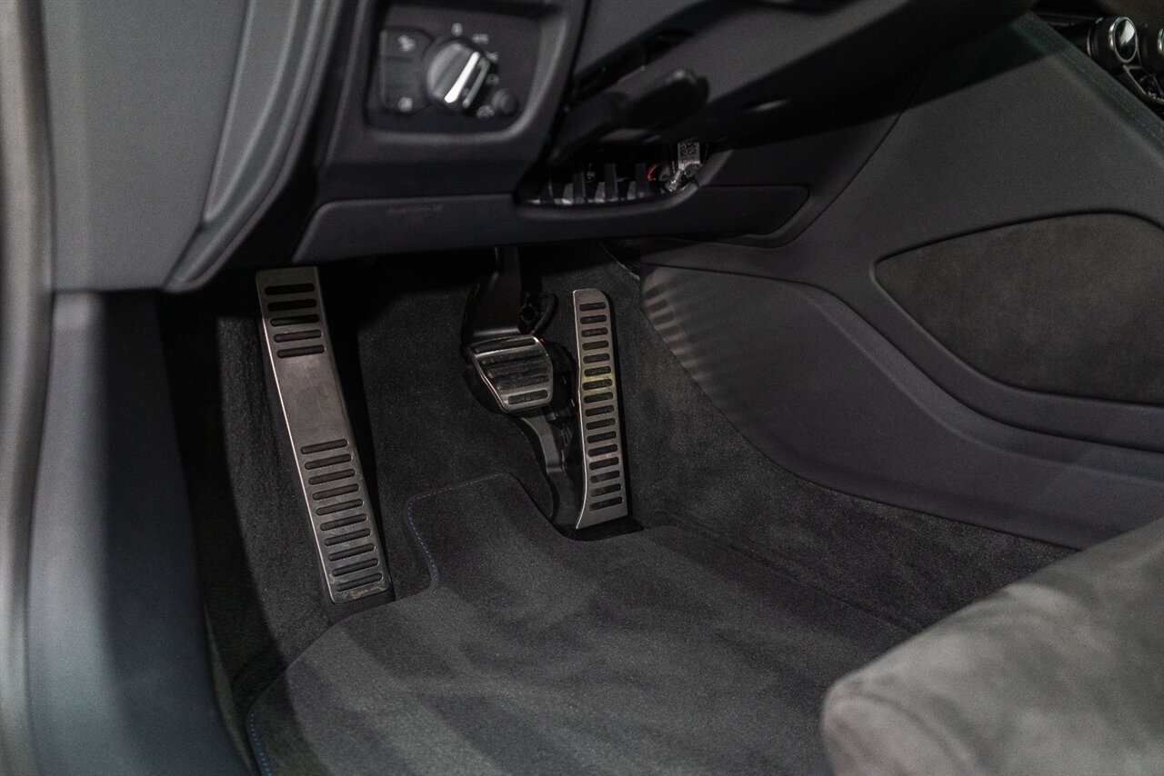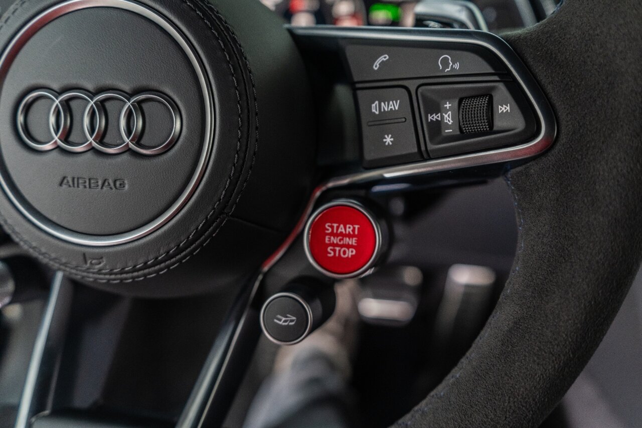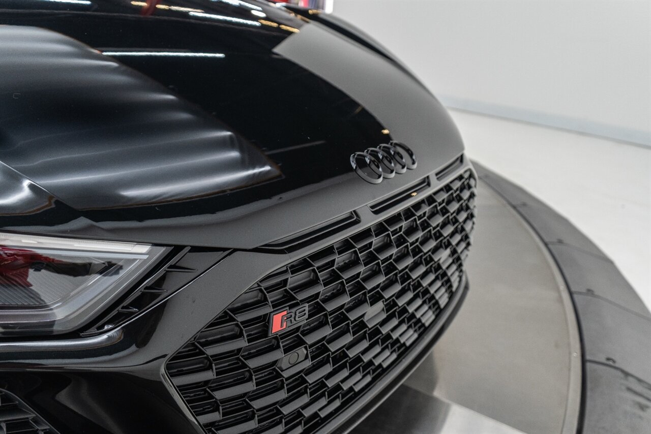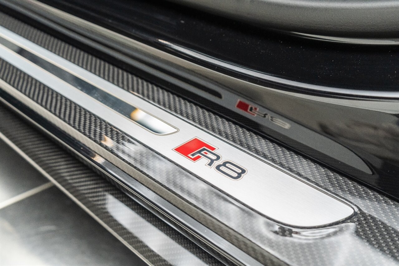 The last of an ERA naturally aspirated V10 Performance Quattro! 602 horsepower revs to the MOON! This freshly serviced and beautiful R8 comes with the following factory options: Mythos Black Metallic Paint, CARBON FIBER FRONT SPOILER, ROCKER INLAY, and EXHAUST SURROUND. R* Performance design package (Alcantara steering wheel, Blue brake calipers, floor mats with blue stitching, gear selector alcantara, Leather/Alcantara seats, BANG AND OLUEFSUN sound system, Dynamic steering, black Audi rings and badges. Enjoy this stunning R8 TODAY!