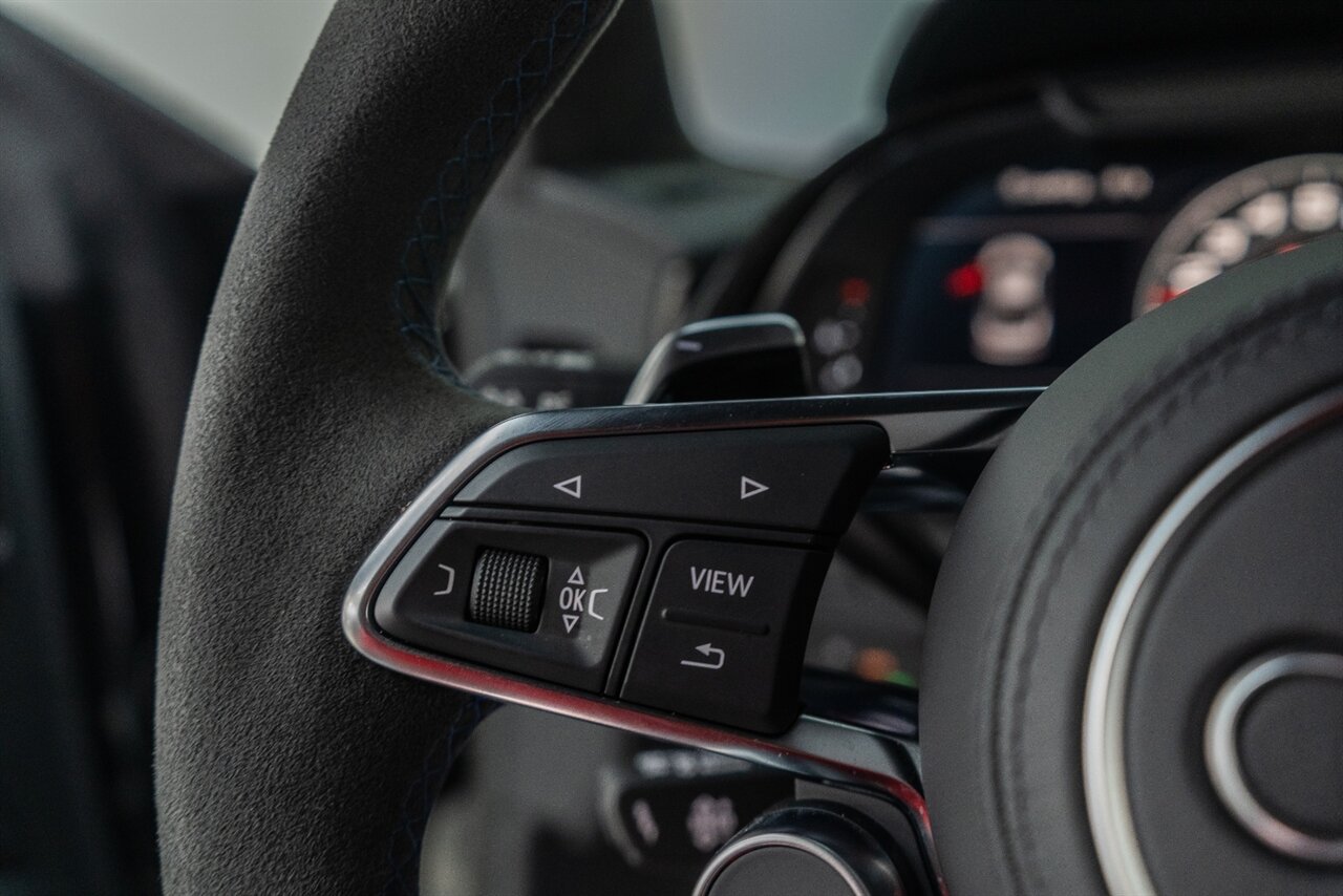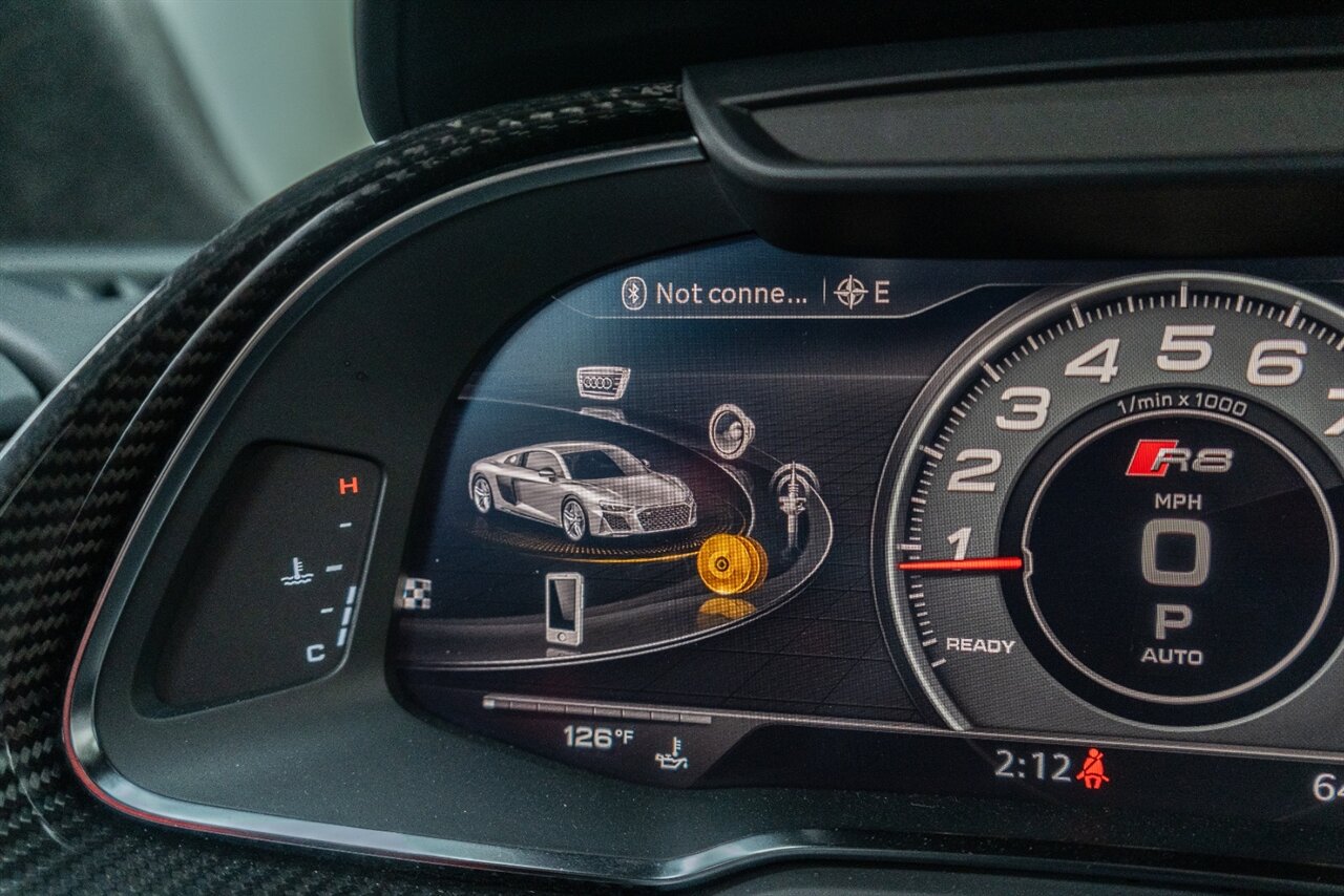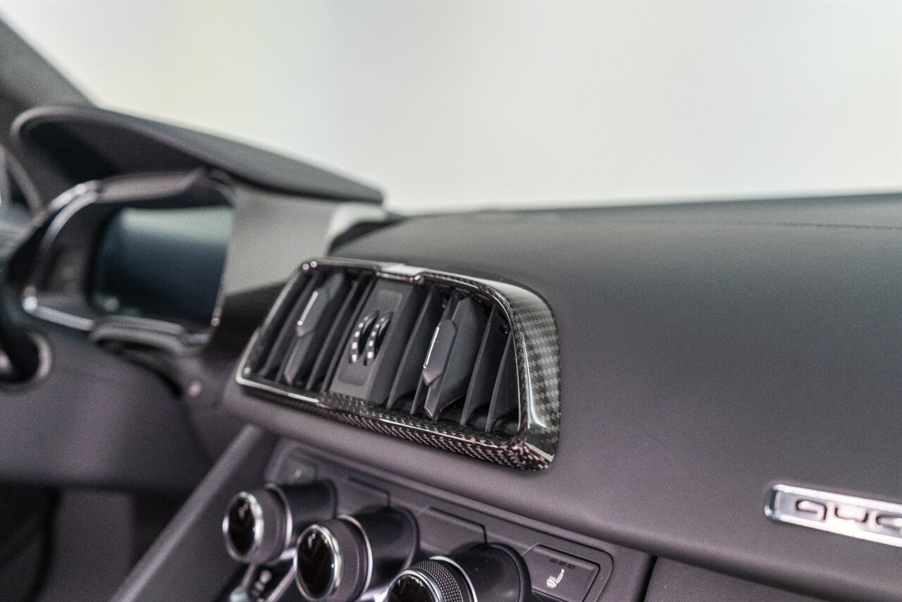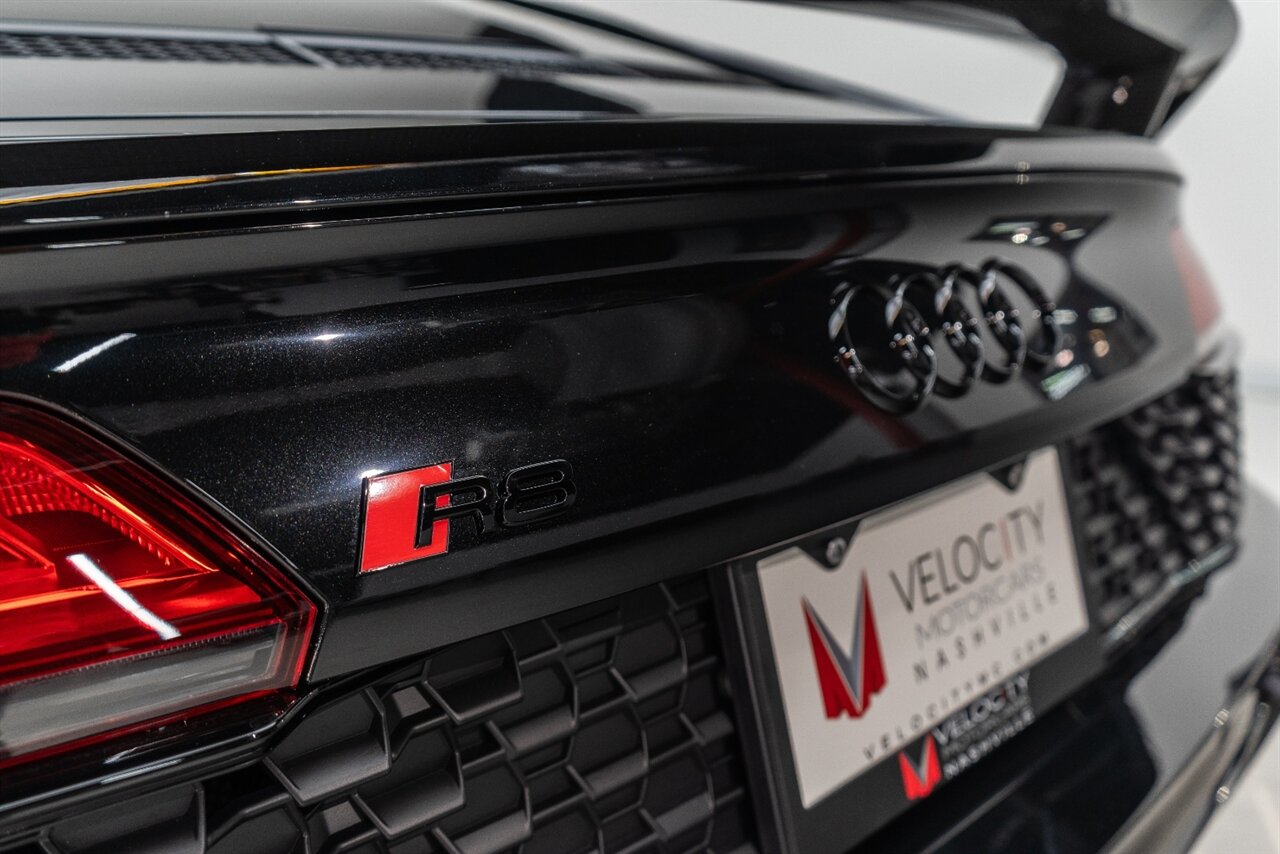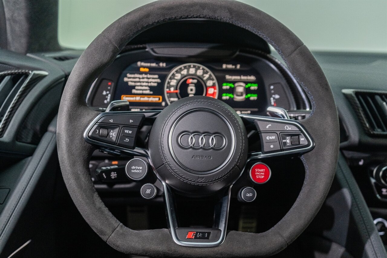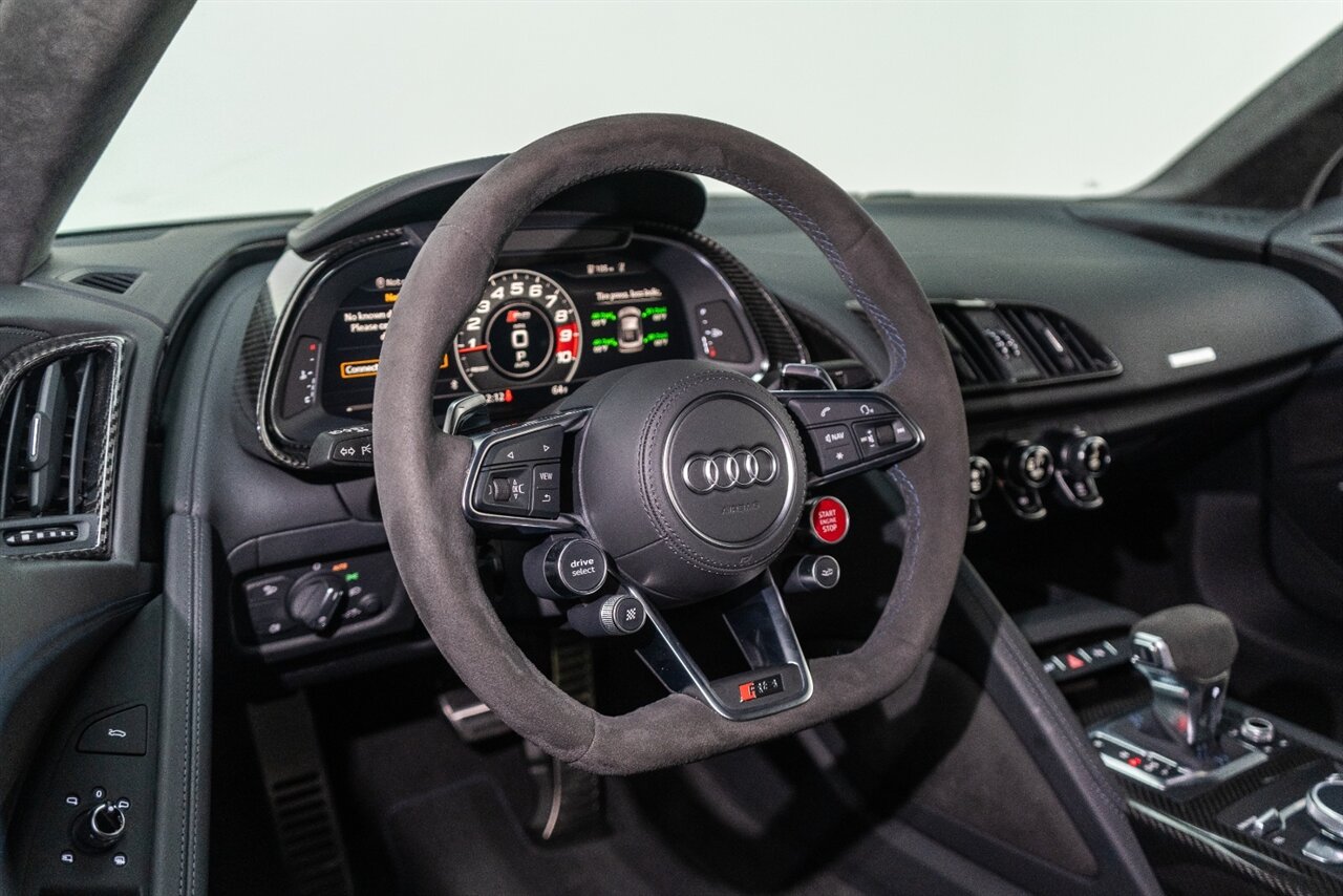 The last of an ERA naturally aspirated V10 Performance Quattro! 602 horsepower revs to the MOON! This freshly serviced and beautiful R8 comes with the following factory options: Mythos Black Metallic Paint, CARBON FIBER FRONT SPOILER, ROCKER INLAY, and EXHAUST SURROUND. R* Performance design package (Alcantara steering wheel, Blue brake calipers, floor mats with blue stitching, gear selector alcantara, Leather/Alcantara seats, BANG AND OLUEFSUN sound system, Dynamic steering, black Audi rings and badges. Enjoy this stunning R8 TODAY!