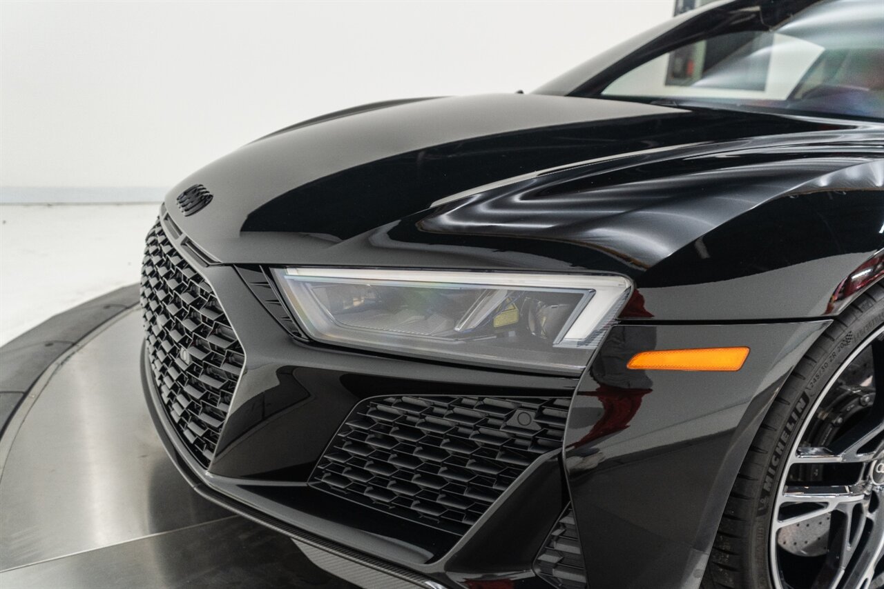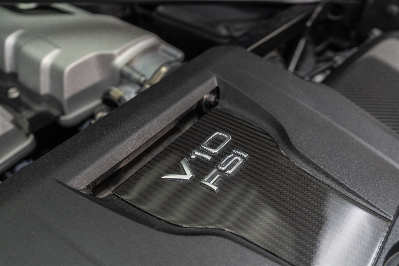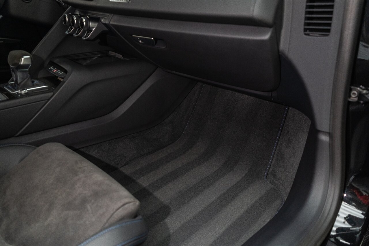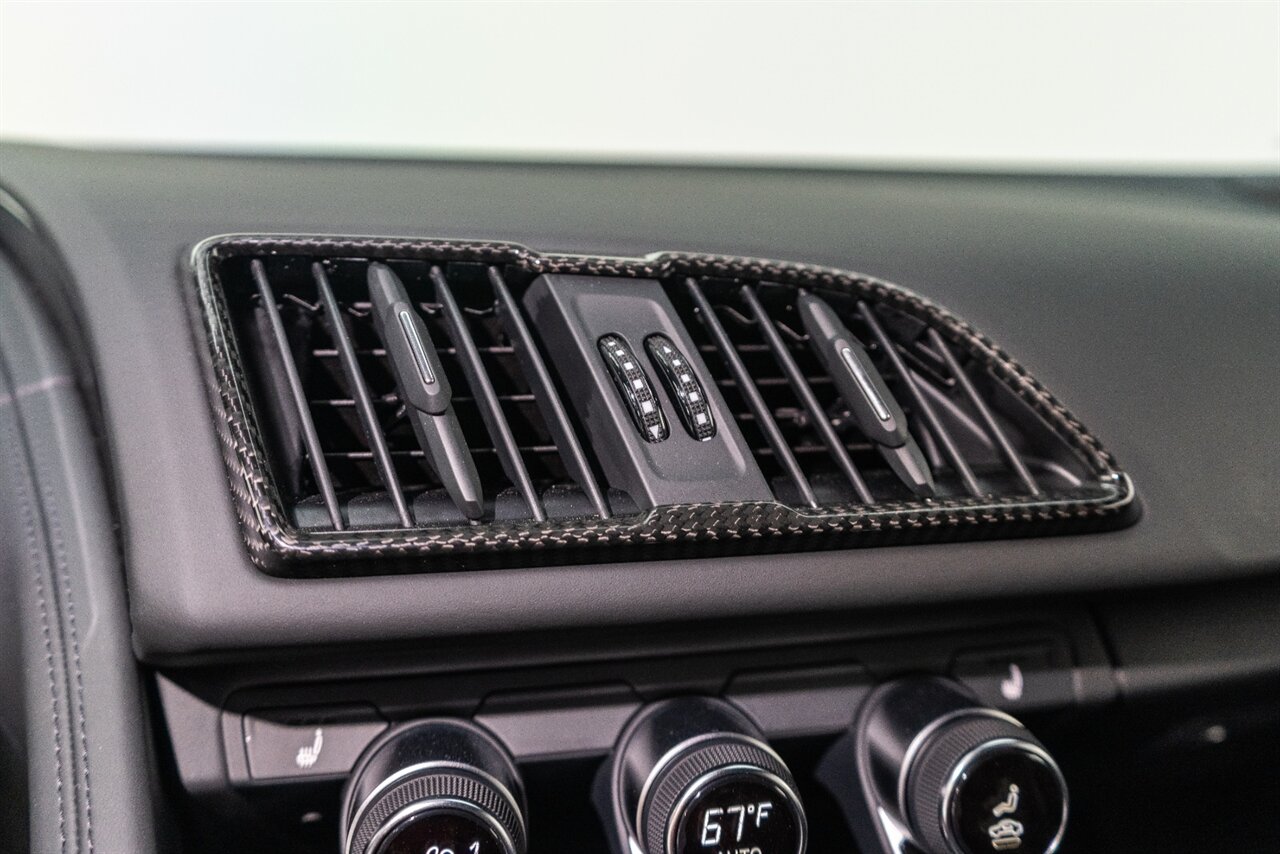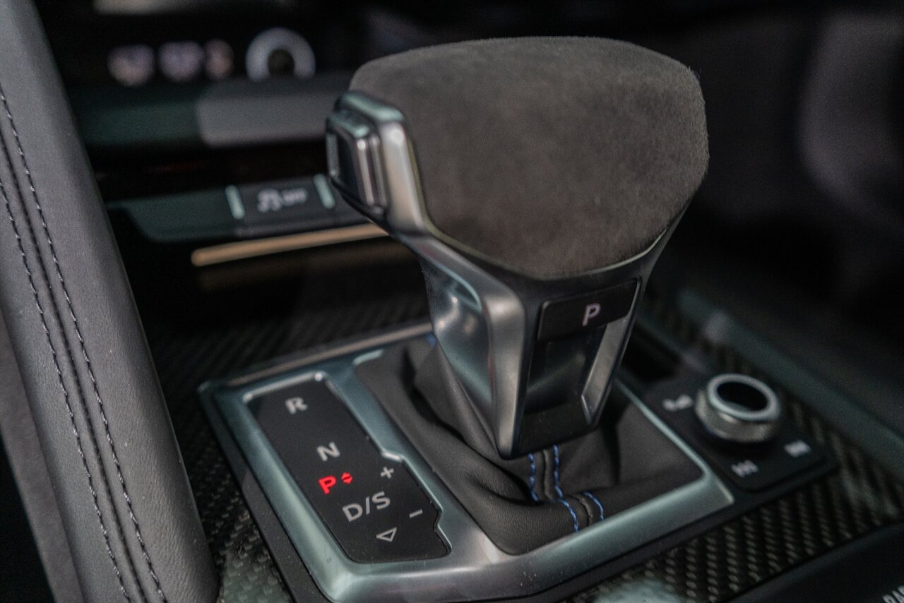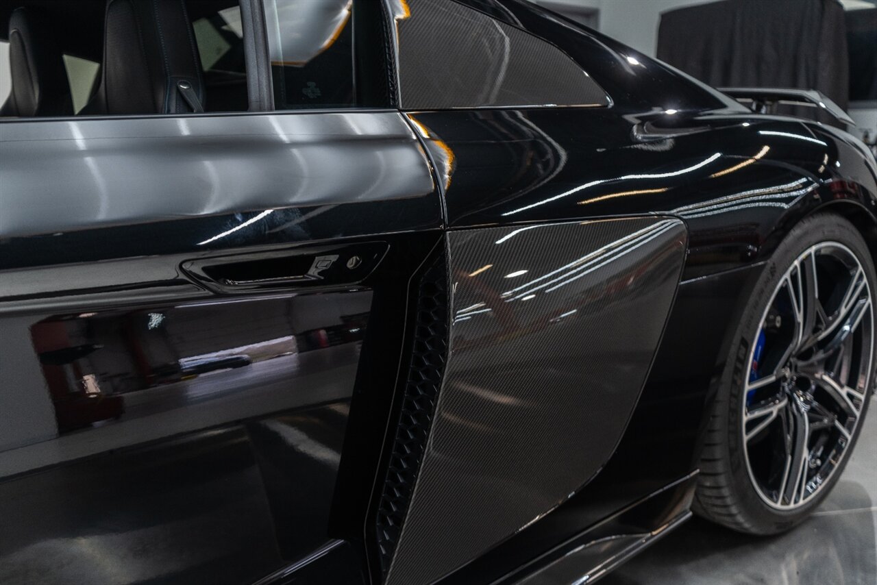 The last of an ERA naturally aspirated V10 Performance Quattro! 602 horsepower revs to the MOON! This freshly serviced and beautiful R8 comes with the following factory options: Mythos Black Metallic Paint, CARBON FIBER FRONT SPOILER, ROCKER INLAY, and EXHAUST SURROUND. R* Performance design package (Alcantara steering wheel, Blue brake calipers, floor mats with blue stitching, gear selector alcantara, Leather/Alcantara seats, BANG AND OLUEFSUN sound system, Dynamic steering, black Audi rings and badges. Enjoy this stunning R8 TODAY!