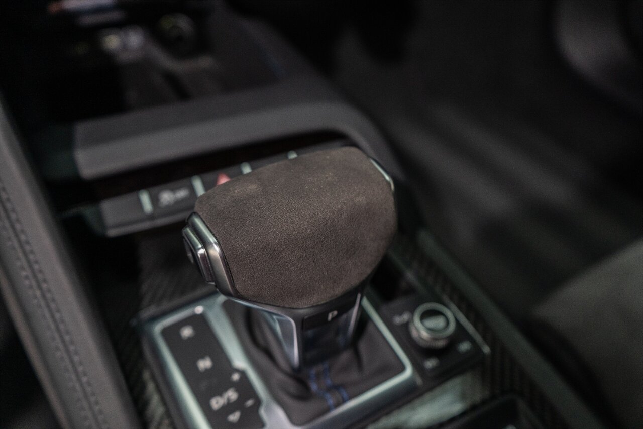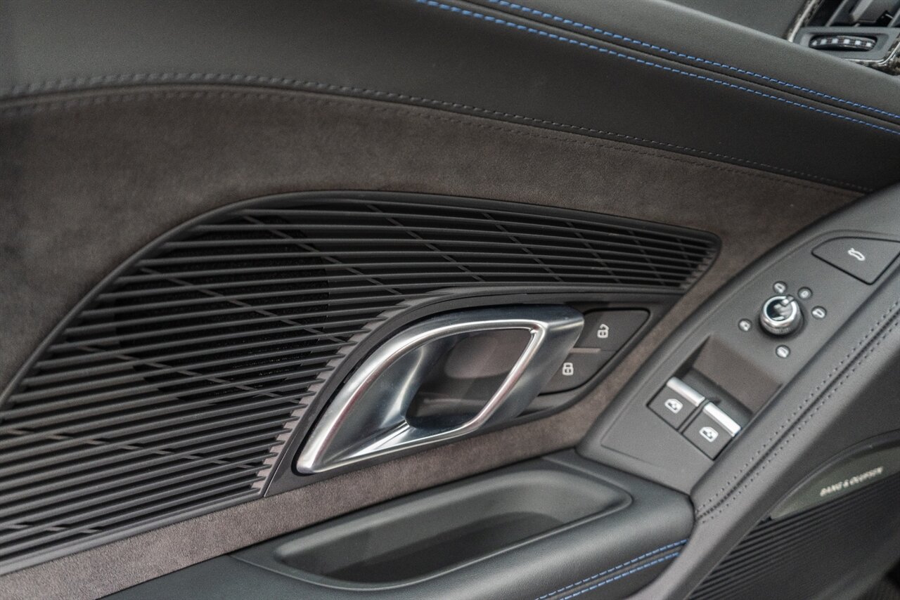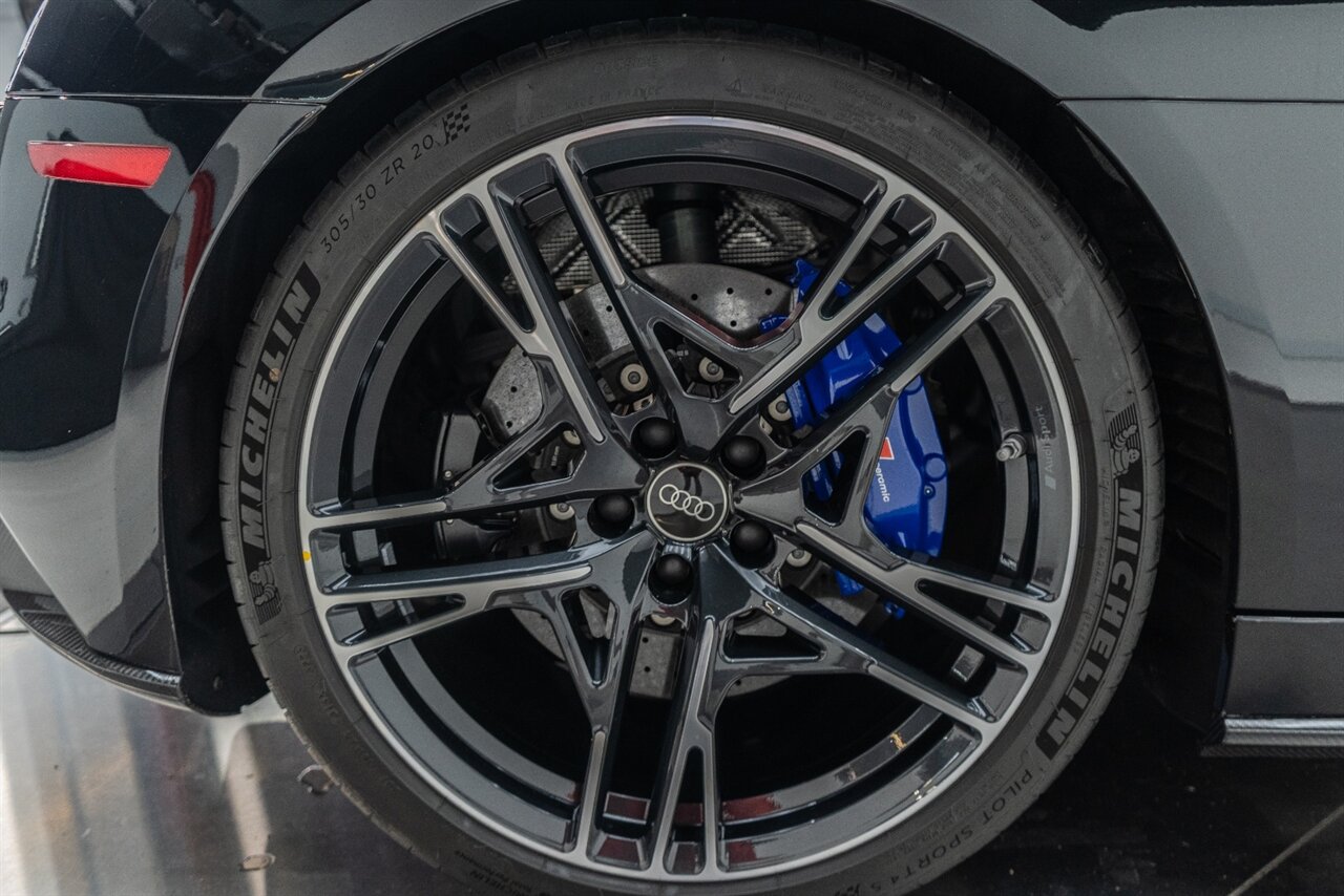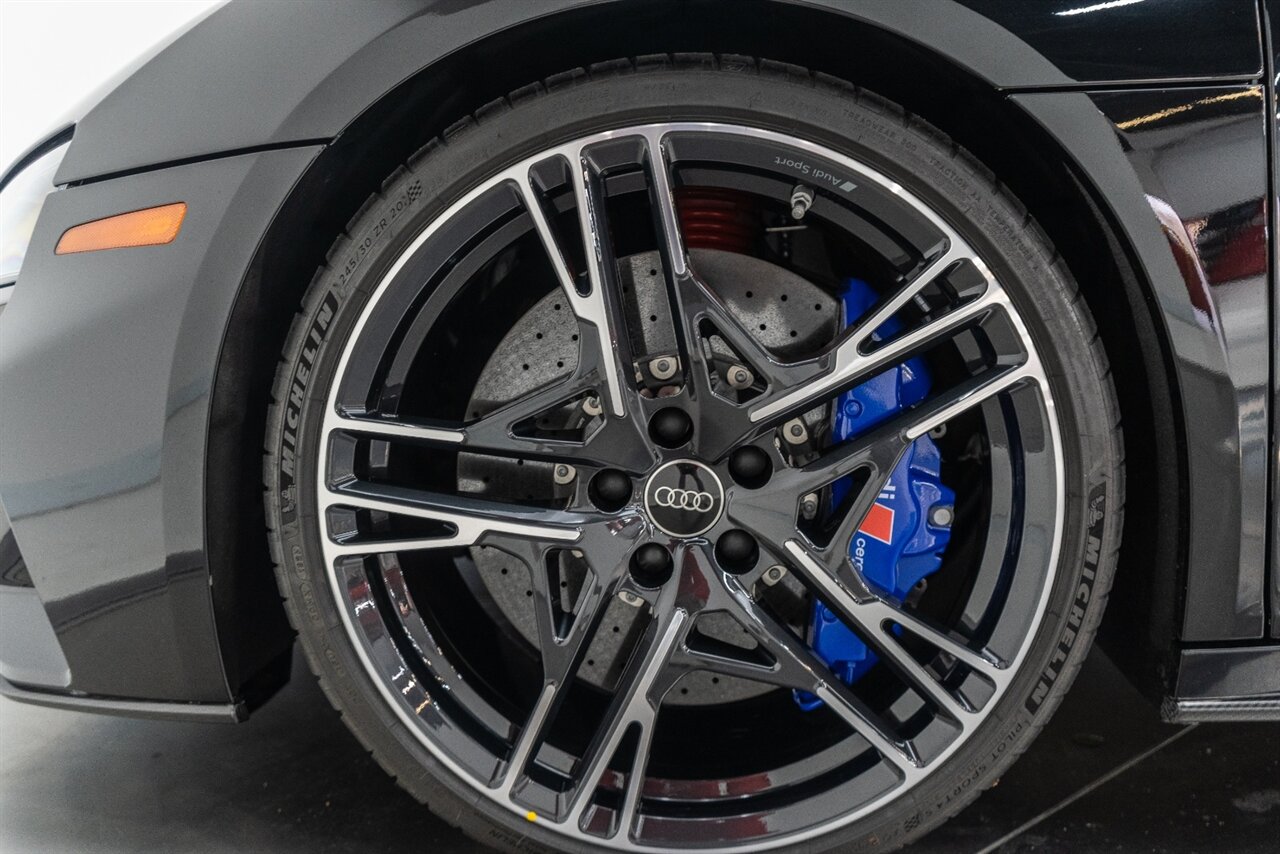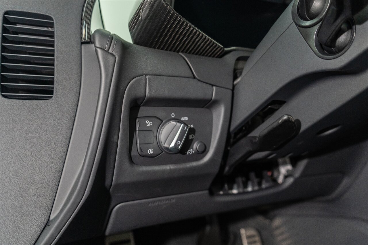 The last of an ERA naturally aspirated V10 Performance Quattro! 602 horsepower revs to the MOON! This freshly serviced and beautiful R8 comes with the following factory options: Mythos Black Metallic Paint, CARBON FIBER FRONT SPOILER, ROCKER INLAY, and EXHAUST SURROUND. R* Performance design package (Alcantara steering wheel, Blue brake calipers, floor mats with blue stitching, gear selector alcantara, Leather/Alcantara seats, BANG AND OLUEFSUN sound system, Dynamic steering, black Audi rings and badges. Enjoy this stunning R8 TODAY!